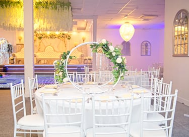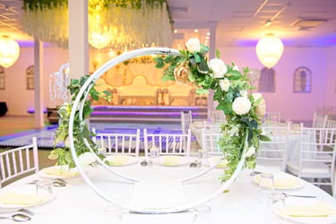 Stepping into the venue was like entering a fairytale with the floral arches, the chic white chiavari chairs. The spacious hall adorned with tasteful decorations exuded sophistication and charm. Every corner was meticulously styled, creating a stunning backdrop for the day's festivities.
